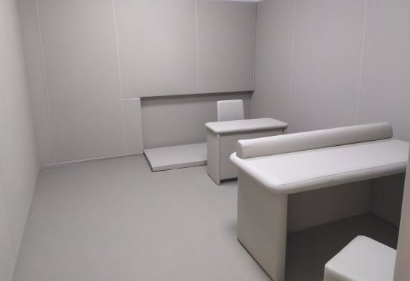 留置室防撞軟包:采用基材具有防火阻燃功能的高彈性聚乙稀發(fā)泡棉,飾面采用原材料阻燃的皮革,兩者進(jìn)行無(wú)膠復(fù)合方法制造而成。其飾面皮革顏色為淺灰色和米黃色,規(guī)格為寬度1250mm,高度2450mm??傮w厚度具有20mm、25mm、30mm。采用軟質(zhì)硅膠收邊條進(jìn)行收邊處理,底座固定收邊條。材料符合國(guó)標(biāo)B1級(jí)阻燃,E0級(jí)環(huán)保,并且安裝方法簡(jiǎn)單易懂,只需要采用環(huán)保水性白乳膠進(jìn)行安裝即可。